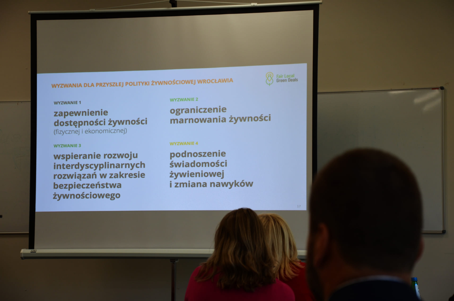 Warsztaty poświęcone ograniczeniu marnowania żywności i podnoszeniu świadomości żywieniowej, Wrocław, 26 maja 2023. Na zdjęciu kadr z prezentacji z wymienionymi czterema wyzwaniami dla polityki żywnościowej Wrocławia.