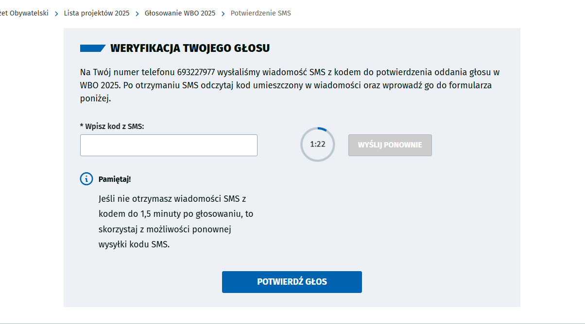Na podany przez Ciebie numer telefonu komórkowego zostanie teraz wysłany kod potwierdzający głos. Wpisz go w oknie formularza. Będziesz mieć na to 1,5 minuty. Dlatego jeśli głosujesz z komputera, pamiętaj by mieć telefon pod ręką.
