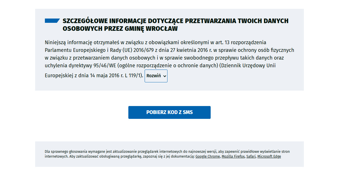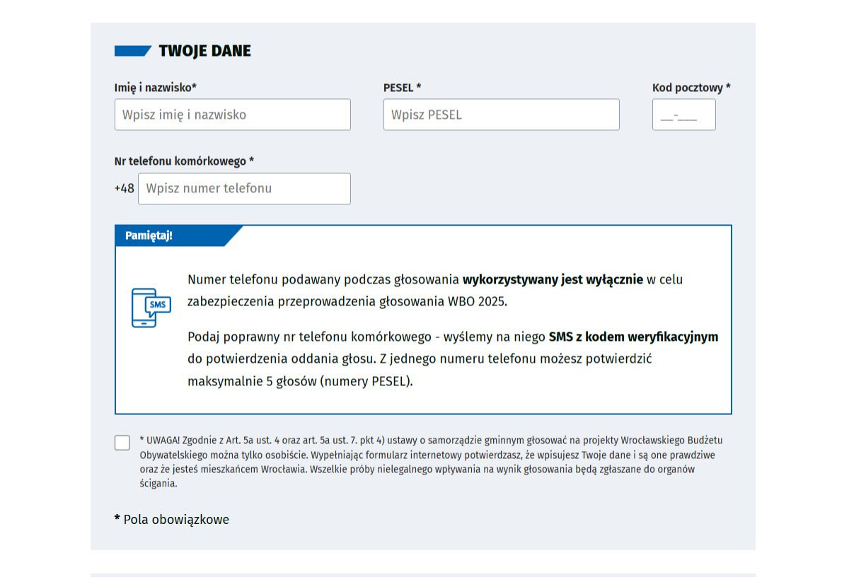 Procedura wygląda podobnie jak w głosowaniu internetowym - w formularzu wpisujemy wybrane projekty, imię i nazwisko, PESEL i kod pocztowy. Nie trzeba już potwierdzać głosu smsem.