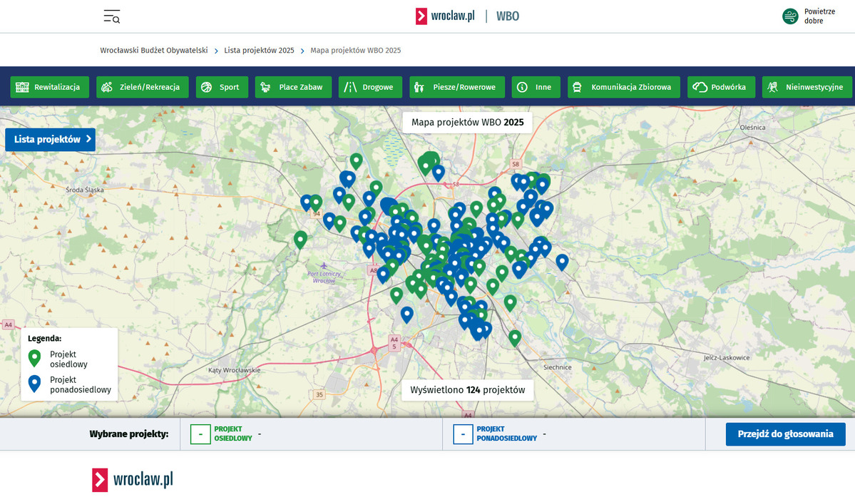 Albo skorzystać z innej metody – znaleźć interesujące Cię projekty na mapie. Kliknij te, które wybierasz, zaznacz przy każdym „dodaj do karty”, a następnie „przejdź do głosowania”. Mapa wygląda w ten sposób: