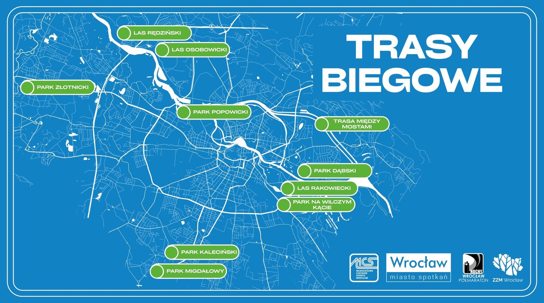W pierwszej kolejności powstała trasa "Między mostami". Oznaczonymi ścieżkami można przebiec 5,8 km między Mostami Jagiellońskimi a Mostami Chrobrego. Tabliczki informacyjne są już tam zamontowane. Wskazują miejsce startu i mety oraz oznaczenia kolejnych kilometrów, a na ich odwrocie umieszczono mapę biegu, która ułatwia orientację w terenie.