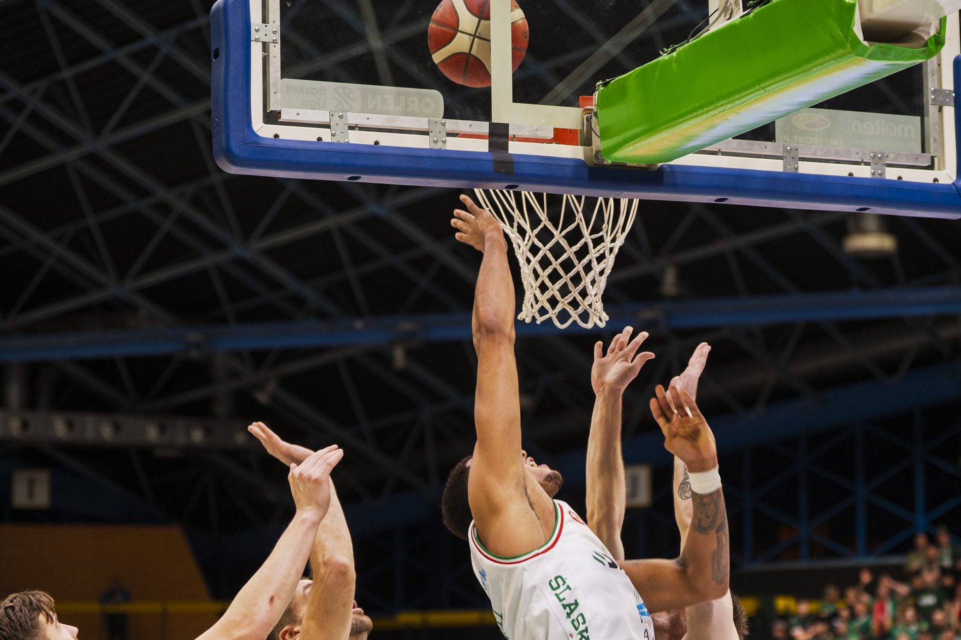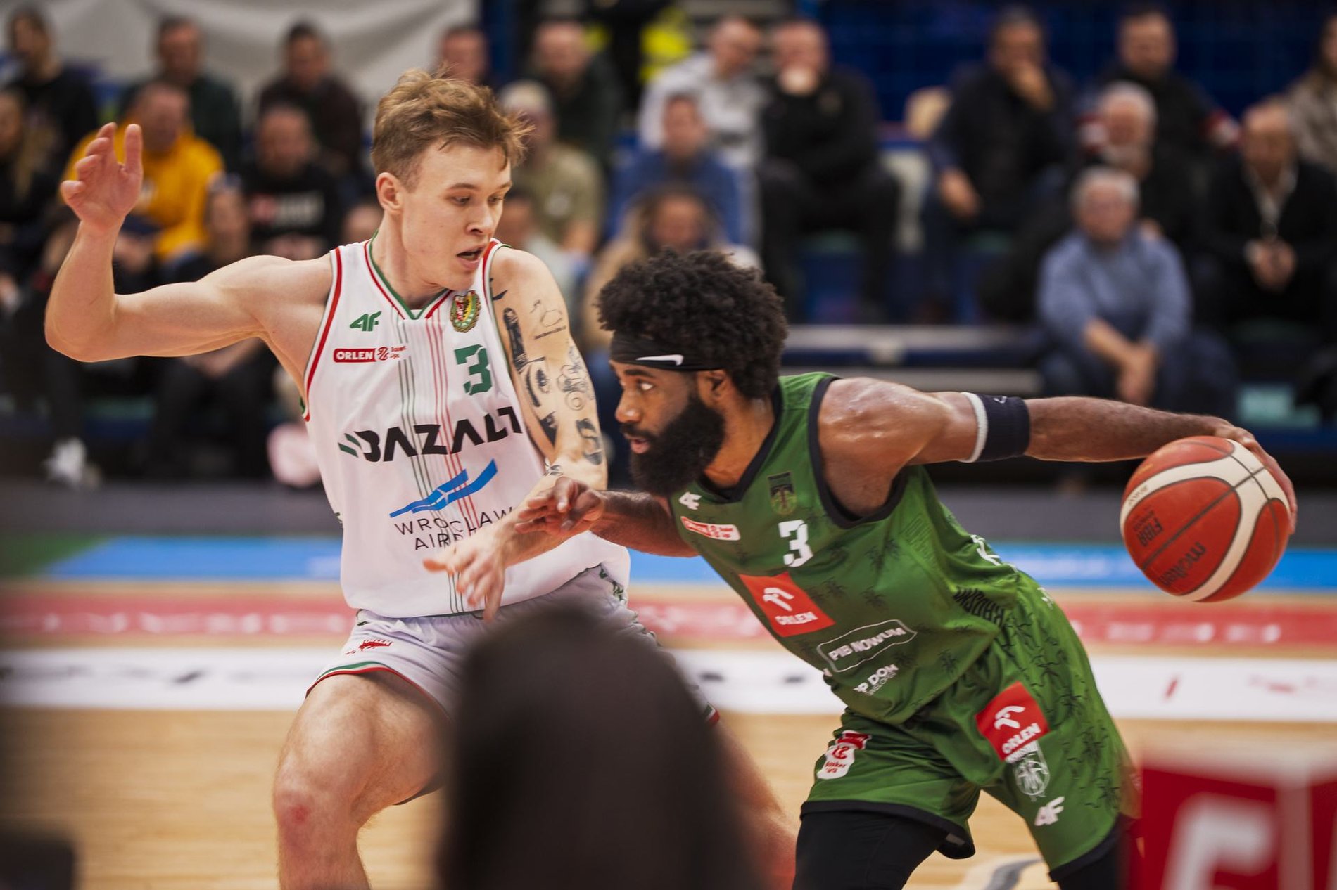 Zdjęcie dzielone na pół: z lewej dwóch koszykarzy z przeciwnych drużyn w trakcie gry; po prawej trybuna pełna kibiców dopingujących zawodników - mecz Śląsk Wrocław - Miasto Szkła Krosno, 11 stycznia 2026 r.