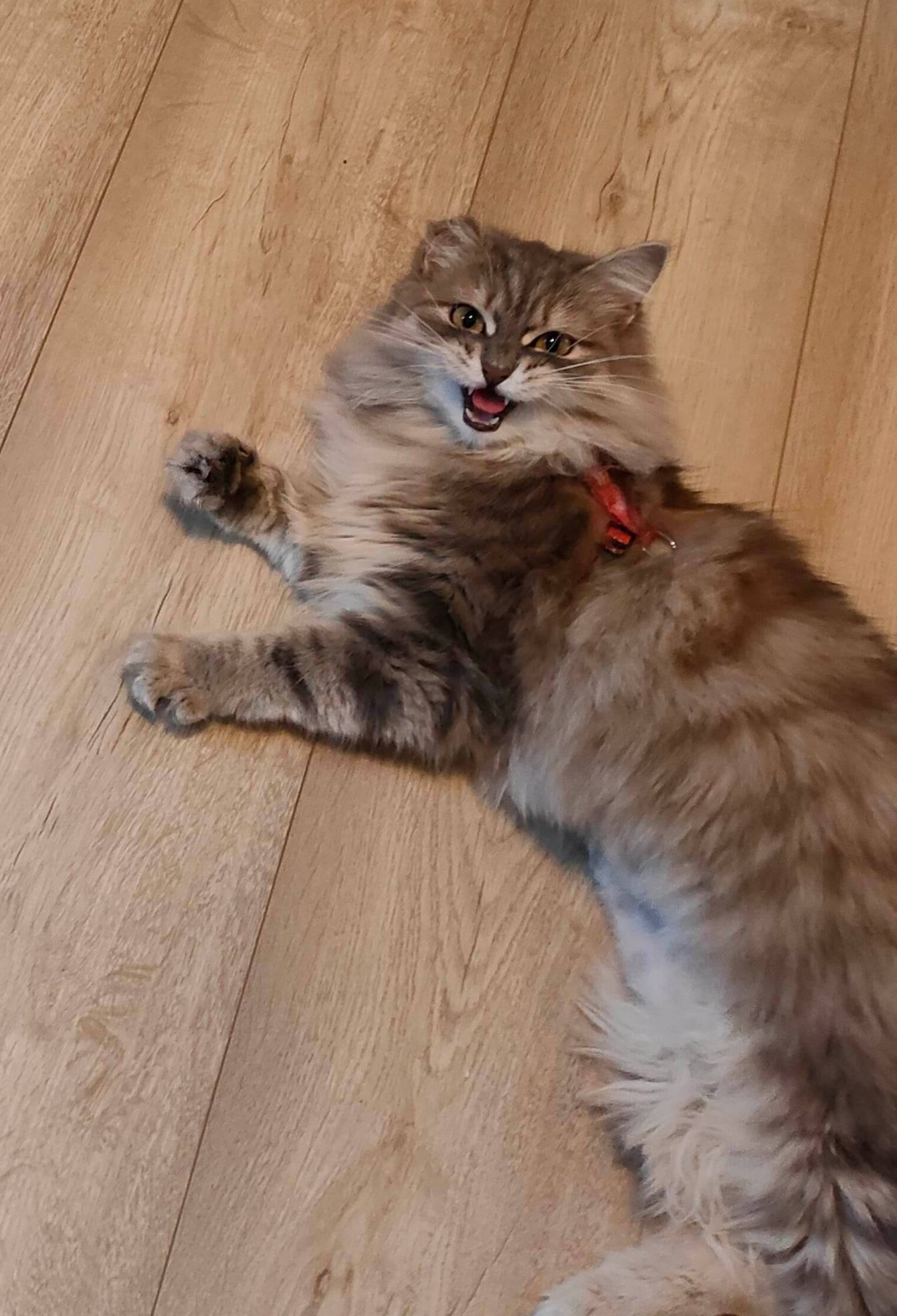 Kulka - towarzyska kotka syberyjska. Do jej codziennych zadań należy obserwacja osiedla, pilnowanie porządku w mieszkaniu, a także okazjonalny atak na przechodzące nogi. W wolnym czasie najbardziej lubi prowadzić właścicieli do zabawek i jeść kurczakowe przysmaki. Jest bardzo wygadana i przy każdej okazji dąży do zainicjowania żywej konwersacji (na zdjęciu uchwycony fragment rozmowy).