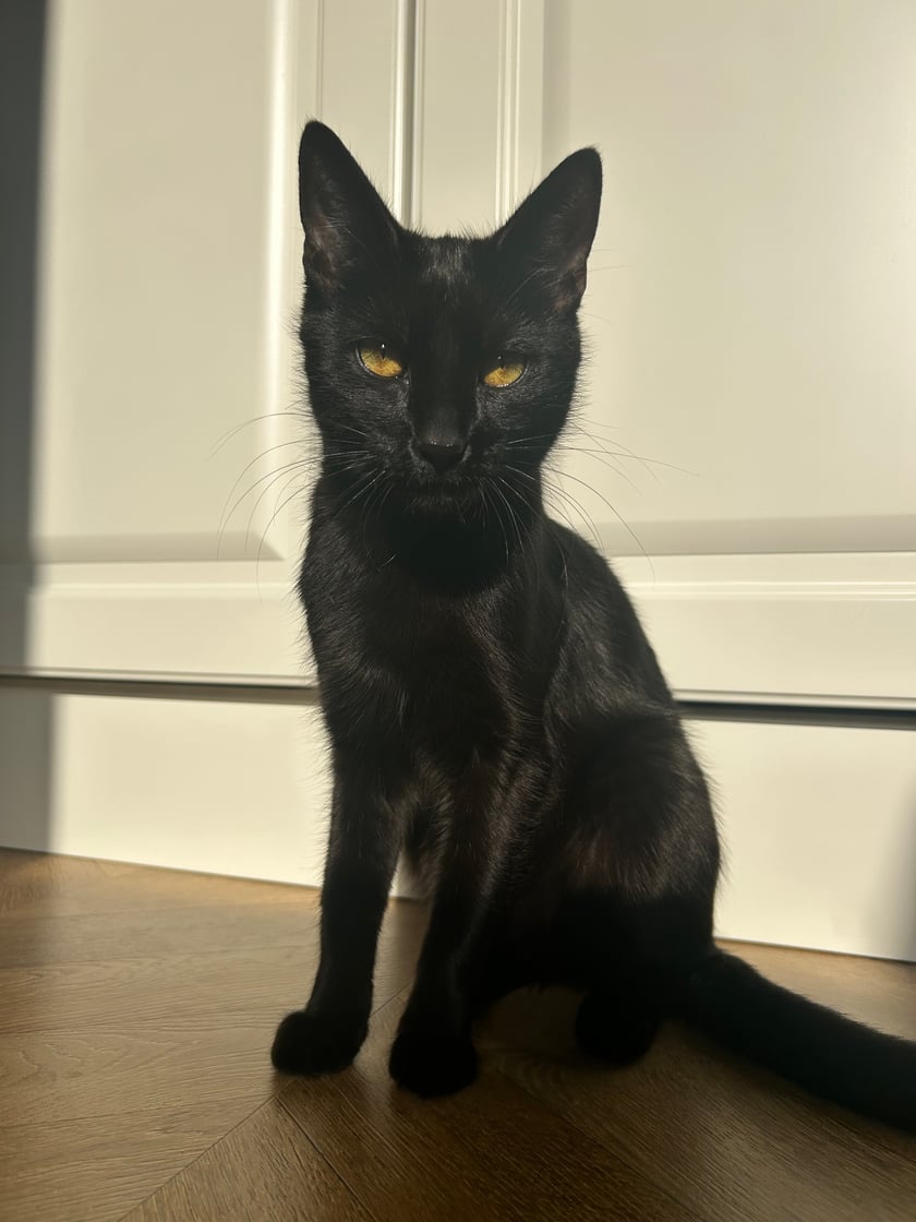 Paris – tajemniczy kocurek o lśniącym czarnym futrze. Złote oczy pełne mądrości, smukła sylwetka i aura elegancji sprawiają, że wygląda jak arystokrata w kocim świecie. Kiedy patrzy, ma się wrażenie, że zna wszystkie sekrety wszechświata… albo przynajmniej miejsce, gdzie schowałam ulubione zabawki