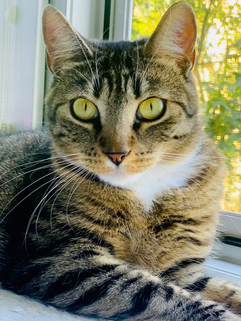 2,5-letnia kotka o hipnotyzującym spojrzeniu. Skradła nasze serce i już rok minął od jej adopcji. Wprowadza wiele radości w nasze codzienne życie … Uwielbia zabawy myszką, wędką czy mniej typowo - korkiem od szampana. Jest naszą bioenergoterapeutką, w wolnych chwilach lubi odpoczywać “na wysokościach“, mając na wszystko oko… czy też oglądać programy przyrodnicze w telewizji…