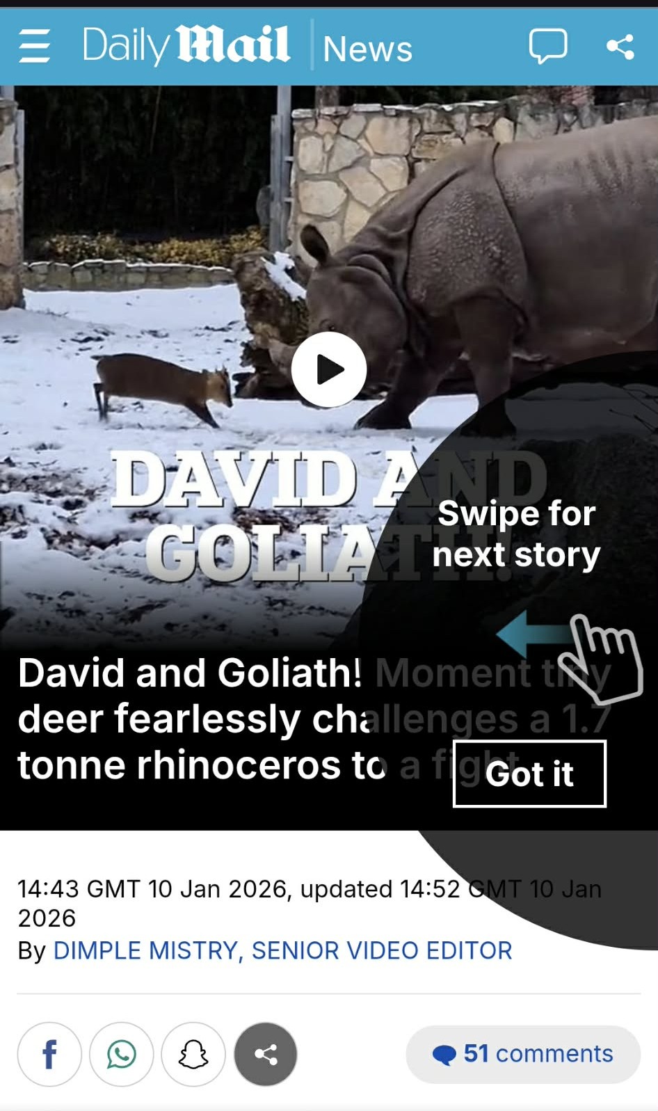 11 / 19 Wróć do artykułu „Pękam z dumy!” – mówi autor znanego na całym świecie filmu o zadziornym mundżaku „Pękam z dumy!” – mówi autor znanego na całym świecie filmu o zadziornym mundżaku Screen z publikacji na temat mundżaka i nosorożca Przejdź do poprzedniego zdjęcia. Poprzednie Następne Przejdź do kolejnego zdjęcia. Mundżak i samica nosorożca robią w sieci zawrotną karierę