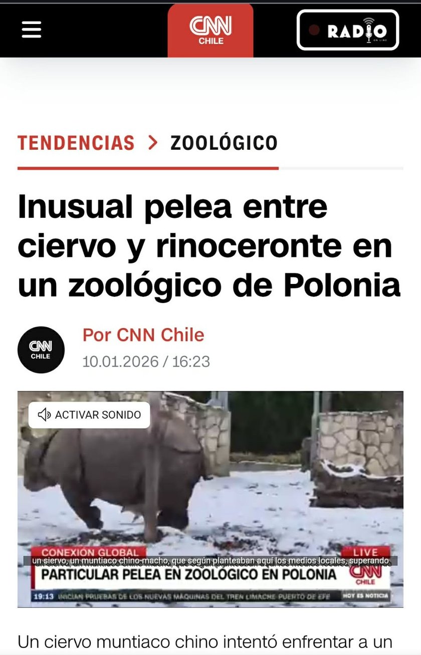 4 / 19 Wróć do artykułu „Pękam z dumy!” – mówi autor znanego na całym świecie filmu o zadziornym mundżaku „Pękam z dumy!” – mówi autor znanego na całym świecie filmu o zadziornym mundżaku Screen z publikacji na temat mundżaka i nosorożca Przejdź do poprzedniego zdjęcia. Poprzednie Następne Przejdź do kolejnego zdjęcia. Mundżak i samica nosorożca robią w sieci zawrotną karierę