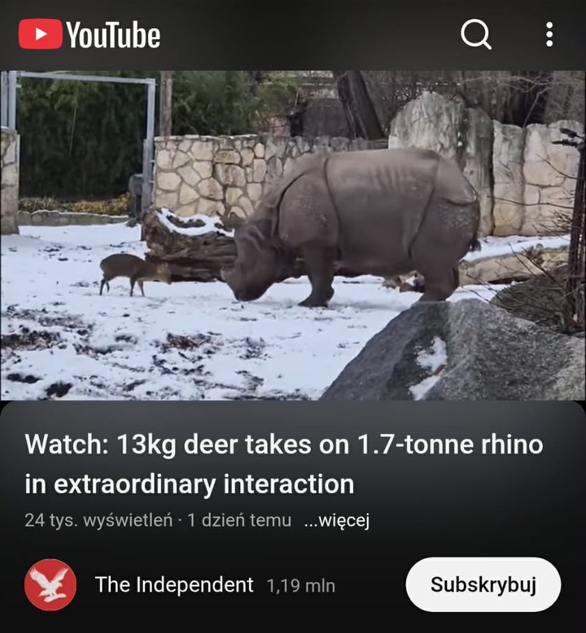 5 / 19 Wróć do artykułu „Pękam z dumy!” – mówi autor znanego na całym świecie filmu o zadziornym mundżaku „Pękam z dumy!” – mówi autor znanego na całym świecie filmu o zadziornym mundżaku Screen z publikacji na temat mundżaka i nosorożca Przejdź do poprzedniego zdjęcia. Poprzednie Następne Przejdź do kolejnego zdjęcia. Mundżak i samica nosorożca robią w sieci zawrotną karierę
