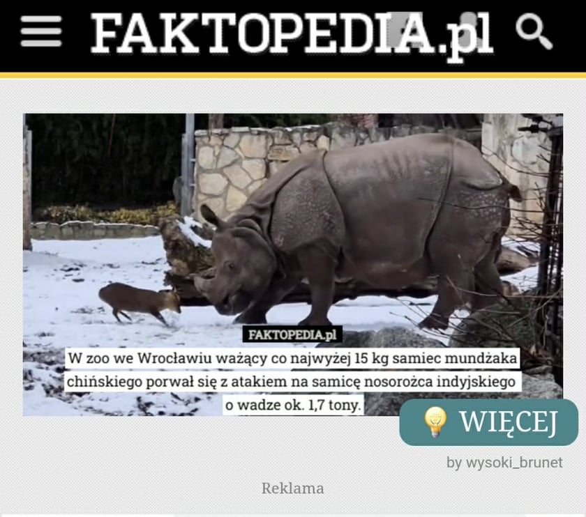 8 / 19 Wróć do artykułu „Pękam z dumy!” – mówi autor znanego na całym świecie filmu o zadziornym mundżaku „Pękam z dumy!” – mówi autor znanego na całym świecie filmu o zadziornym mundżaku Screen z publikacji na temat mundżaka i nosorożca Przejdź do poprzedniego zdjęcia. Poprzednie Następne Przejdź do kolejnego zdjęcia. Mundżak i samica nosorożca robią w sieci zawrotną karierę