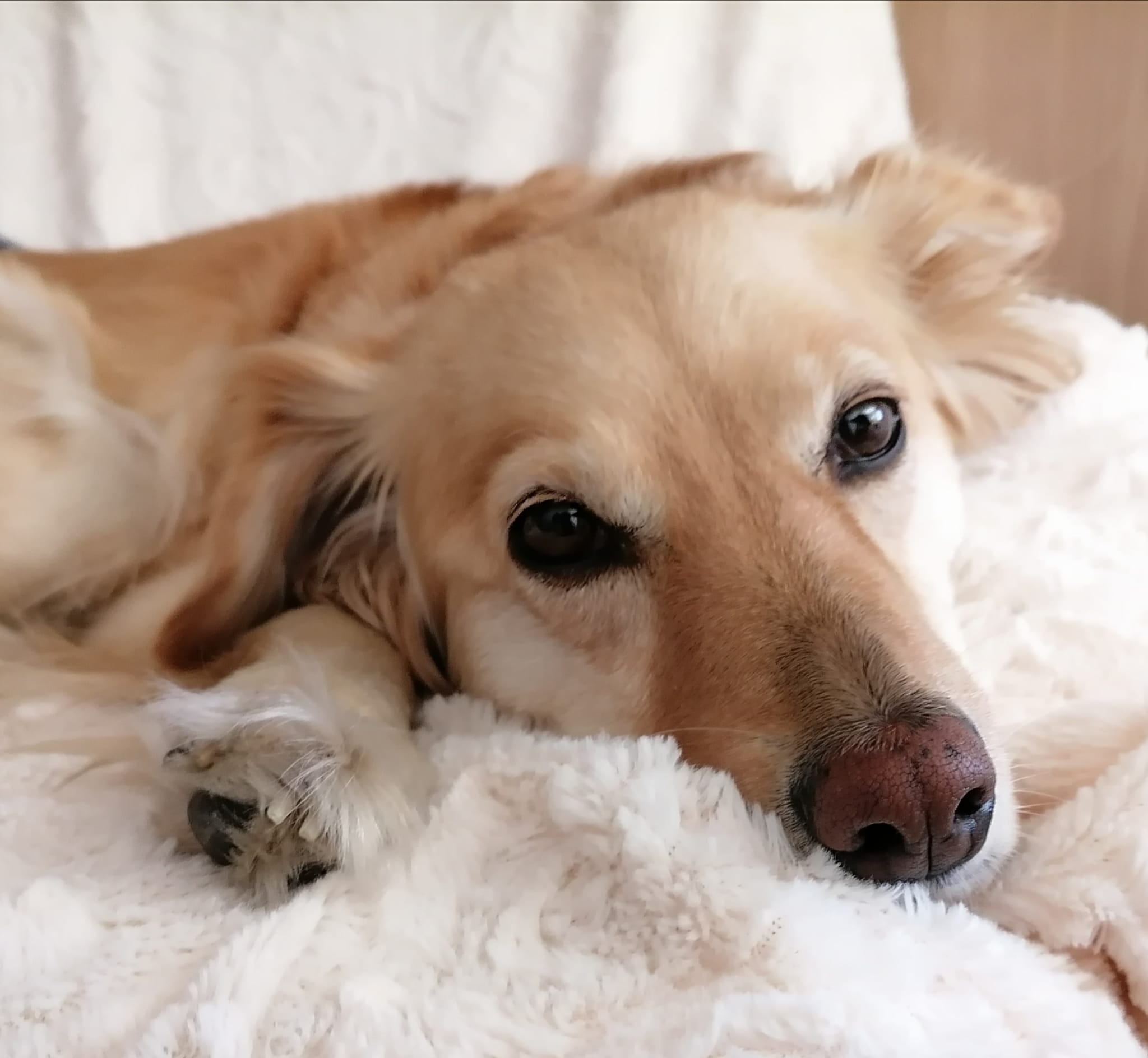 Gapsa zazwyczaj jest uśmiechnięta i bardzo radośnie cieszy się życiem :-) Na zdjęciu odpoczywa i myśli o zbliżającym się spacerku, aby chłonąć pełną piersią powiewy wiatru :-)