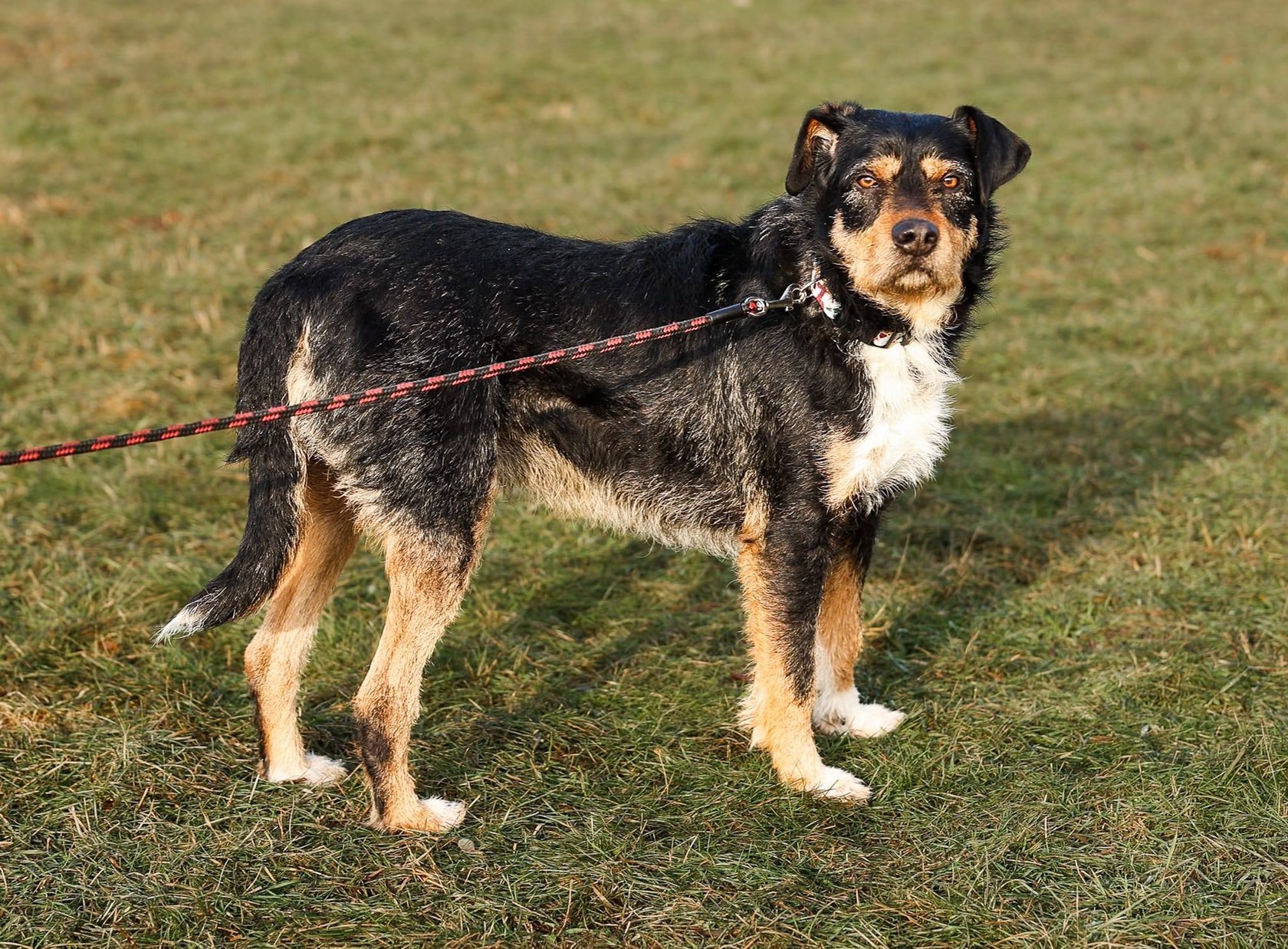Pies, ok. 4 lat. Bardzo miły, spokojny, grzeczny. Nieco wystraszony i szalenie uległy. Zaczepia człowieka, lubi głaskanie.